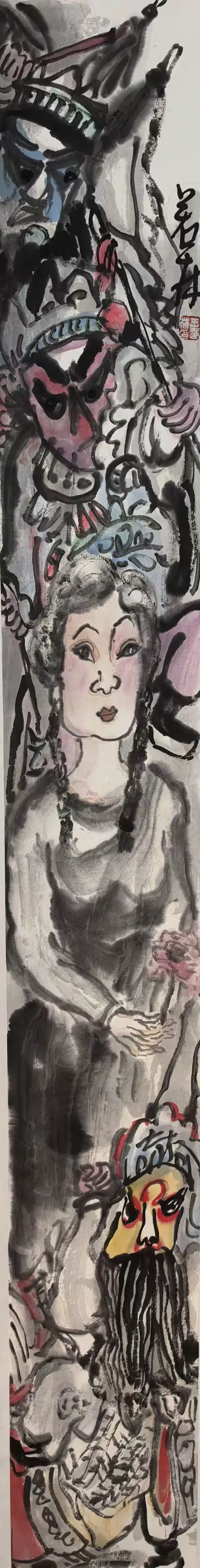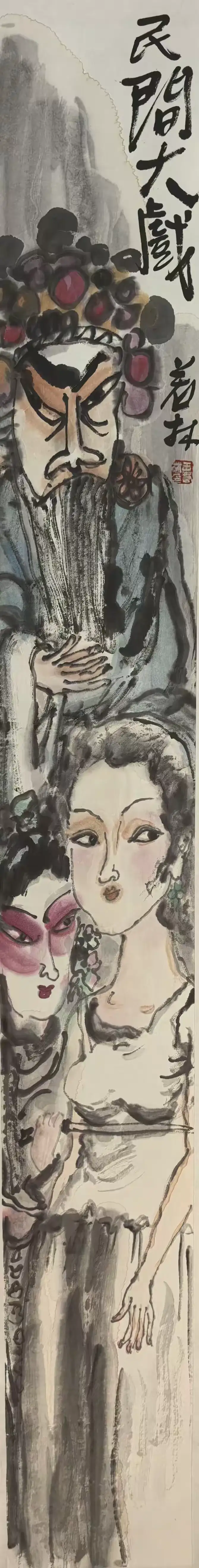 《民间大戏》系列脱胎于民间社火、地方小戏的原生场景:作品里的旦角眉眼、花脸轮廓,并未复刻专业戏曲的精致程式,而是抓取民间戏曲 “接地气” 的符号 —— 比如头饰上艳色的散点点缀、服饰以墨块堆叠出的粗放质感,既保留了民间戏曲的热闹鲜活,又剥离了舞台艺术的繁复框架。