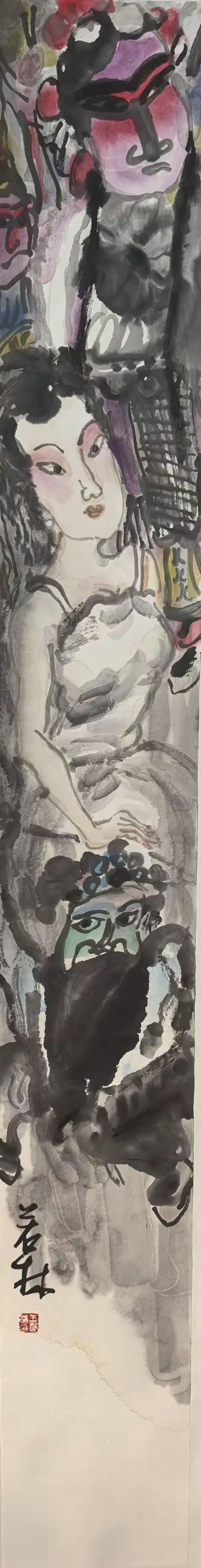 以淡彩点睛破墨气:旦角的腮红、头饰的红点、花脸的色块,都以轻淡却鲜亮的色彩点染,既不压过水墨的写意性,又带出民间艺术的艳俗活力。