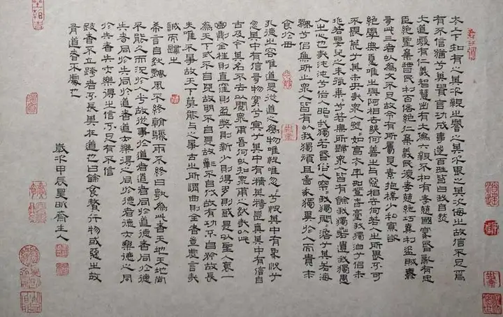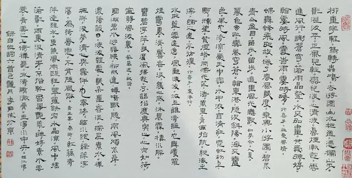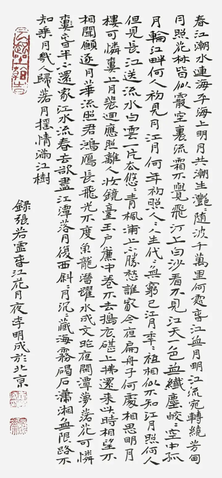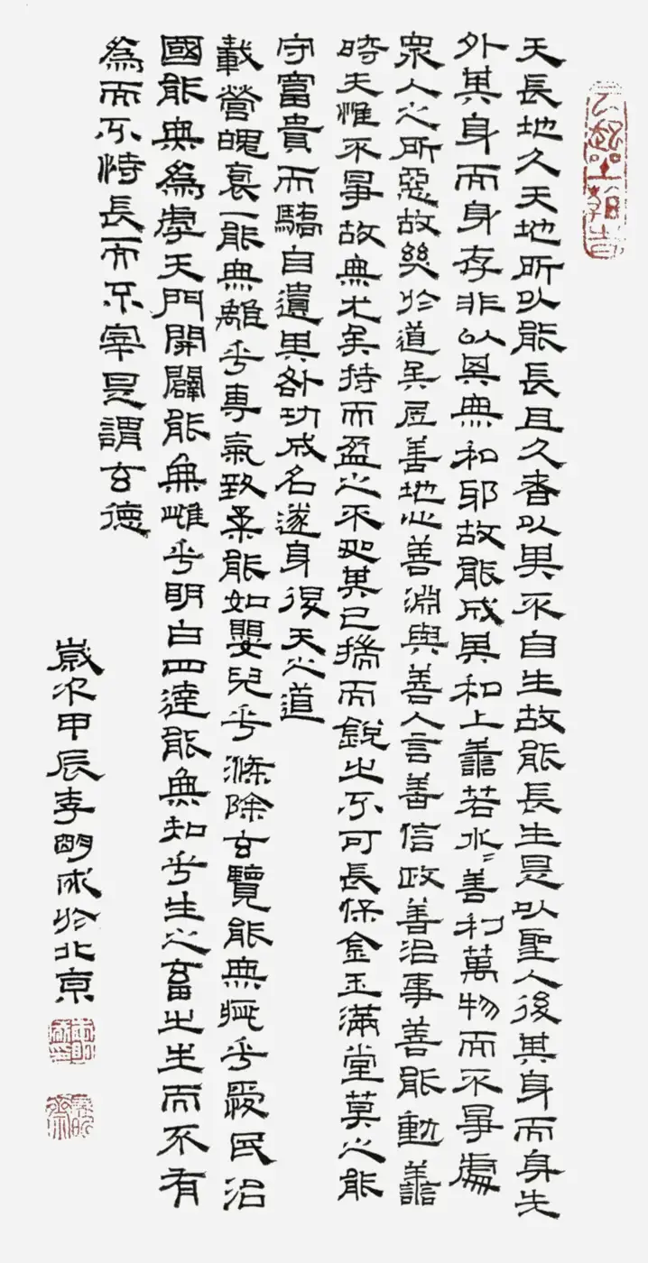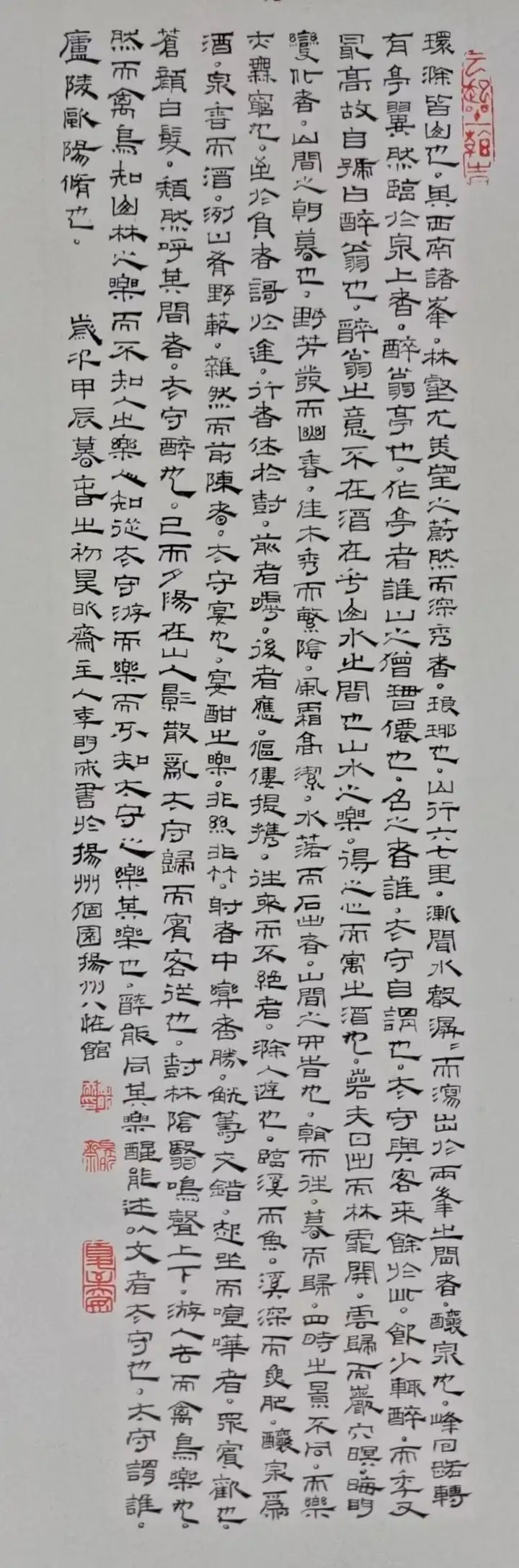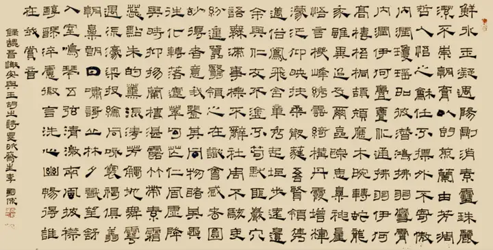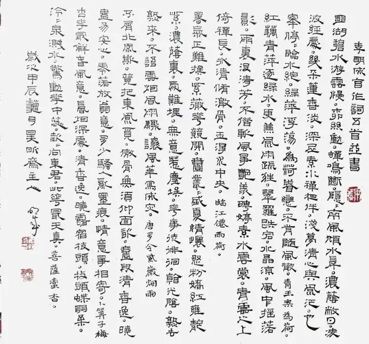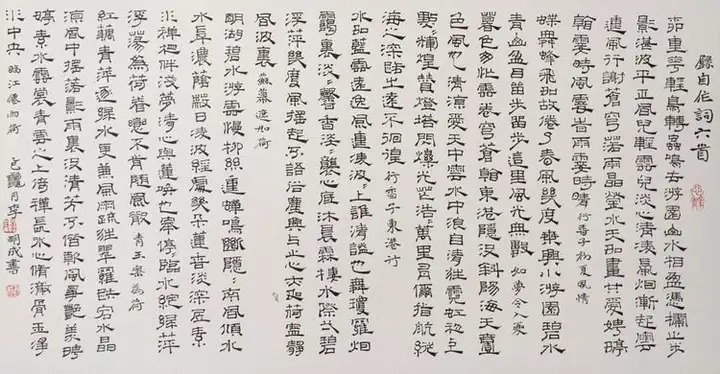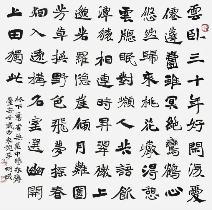 当今书坛,跟风趋俗之风盛行,不少创作者甘于平庸,流于泛常理解。而明成始终坚守自我审美追求,独标气骨,以笔墨为媒,构建起属于自己的艺术语言。他不仅在小隶书创作上取得卓越成就,更填补了该领域理论与实践之空白,为后学者开辟了道路。作为当代小隶书第一人,明成之艺术探索,不仅是对传统书法文脉之传承,更是对当代书法创新之有益尝试。余深信,假以时日,明成必将在艺术之路上更攀高峰,为当代书坛留下更多不朽之作,其艺术精神与成就,亦将载入书法史册,为后人所敬仰。