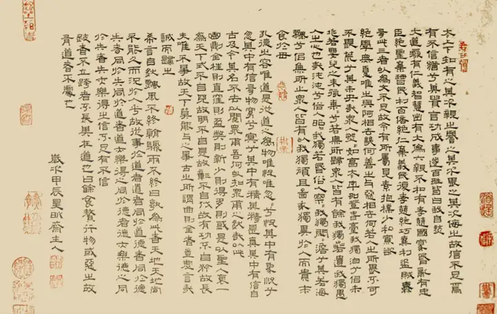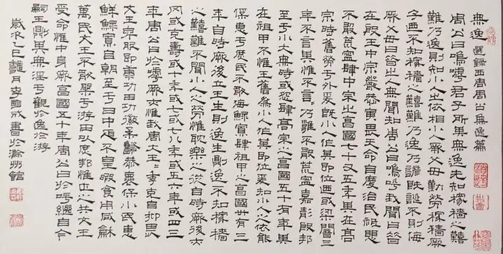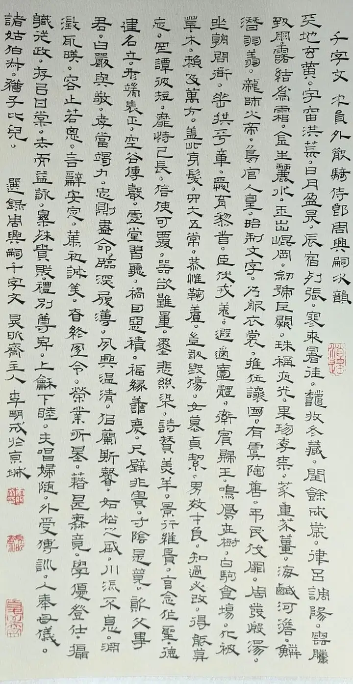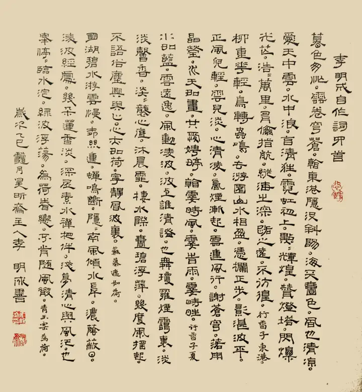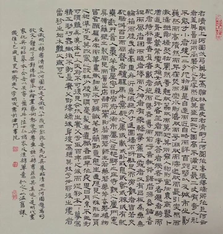 李明成学书之道,秉持“溯源古法、博采众长”之旨。其小隶书创作,初以汉隶经典为根基,潜心钻研《张迁碑》之古朴雄浑、《乙瑛碑》之端庄典雅、《石门颂》之奇崛开张、《史晨碑》之严谨平和、《华山碑》之秀逸多姿、《礼器碑》之瘦劲刚健,于汉隶诸碑中汲取养分,练就扎实笔法与深厚功力。而后,他上溯元明,将元代吴叡之清劲、萧维斗之古拙,明代文征明之温润、陆世仁之秀逸尽收笔底,融会贯通。更难得者,他不满足于对近世名家的借鉴,进一步回溯至西汉成熟碑帖《熹平石经》与《受禅表》,取《熹平石经》之庄重规整、《受禅表》之灵动秀雅,为其小隶书注入更为古远之气息。