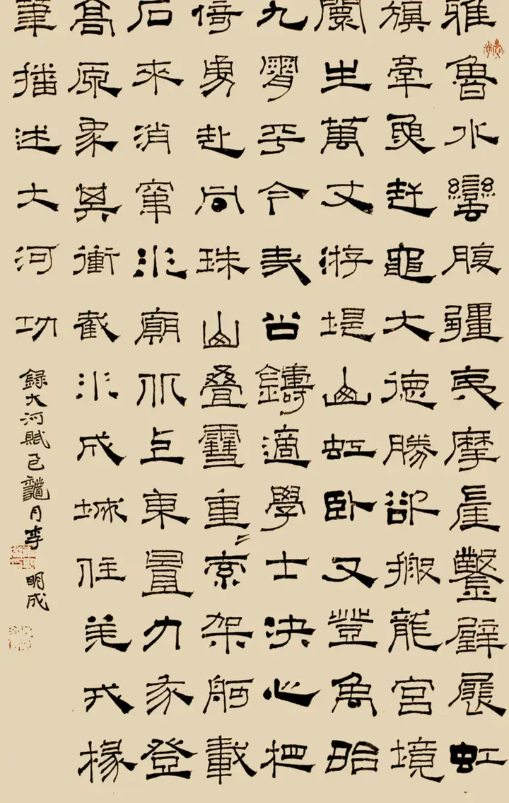 数十年临池不辍,明成终将汉隶之雄浑、元明诸家之雅韵、古碑之庄重融为一体,形成独树一帜之小隶书艺术风格。其作品既不失传统法度,又具鲜明个人特色,笔墨间散发着荡人心魄之文气。观其书,线条遒劲灵动,中峰着力,刚柔并济;结体严谨多变,疏密有致,开合有度;墨色枯湿相生,浓淡相宜,层次丰富。他以扎实之传统功力为根基,以开拓创新之精神为引领,于空白之处开辟新境,让小隶书这一古老书体在当代焕发出蓬勃生机。