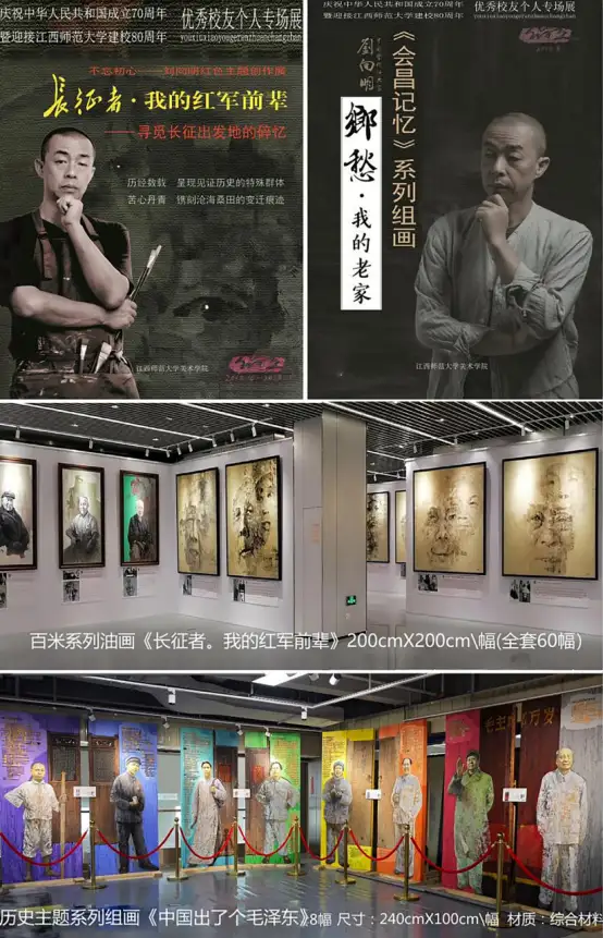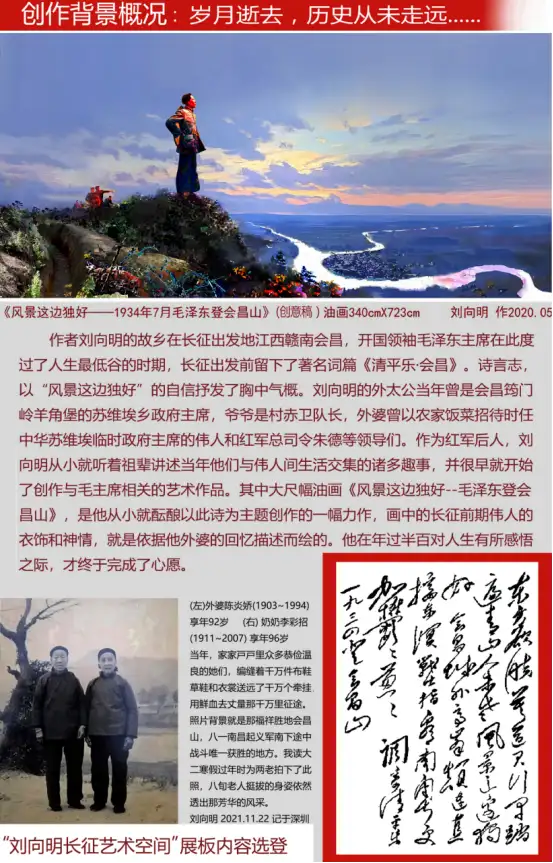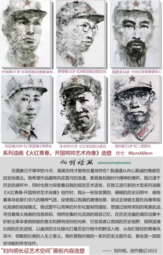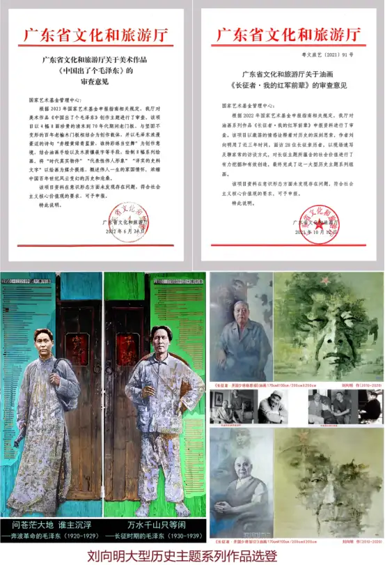 刘向明出生于著名的红色老区、长征出发地江西赣南会昌县,成长于北方军营。红军后人的血脉基因和军旅情结滋养了他的艺术初心。自2010年起他开启遍访全国寻找现存长征老红军的艺术之旅,费尽周折面见长征开国将士们,以现场速写及聊家常的访谈方式,感悟历史亲历者们的内心世界,历经十年创作了大型历史主题系列组画《长征者·我的红军前辈》,又历经三年创作了大型历史主题系列组画《中国出了个毛泽东》,均获广东省文化旅游厅审读发文通过申报国家艺术基金评选。刘向明以激荡的情感和极具前瞻性的见识,诠释着对历史的深刻思索,对长征主题所蕴含的社会价值进行了有力挖掘和有效创造。百米系列作品具有不可复制的独特性及唯一性,以其独具匠心的艺术形式概述了伟人和革命先辈们的家国情怀,浓缩了中国百年世纪风云变幻的历史和沧桑,刻录下一代国人集体情感的记忆痕迹。在庆祝建党百年之际,创作事迹及作品在中宣部学习强国平台、中央广电总局大亚湾之声等国内外媒体广泛报道,并受邀在省内外大学、各地政府部门、深圳市各区举办专场个人画展,成功地进行了艺术探索与文化实践,意义重大影响深远。