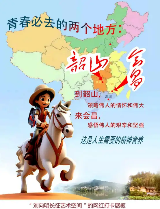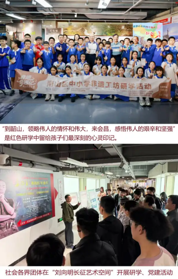 2024年,在深圳市南山区领导的关怀下,南山文化馆依托深圳知名油画家、南山区专职美术创研员刘向明的艺术成果,设立了“刘向明长征艺术空间”与“东纵先辈传世艺术肖像创作基地”。这里存集展示了油画家刘向明二十余年的部分创作心血,分为“长征碎忆”、“世纪风云”“战火青春”“东纵风采”四个主题,结合创作经历和作品背景故事,让深圳特区的市民们感受艺术视觉语言阐述的红色历史传奇。针对当今社会红色情怀缺失、抗压心态脆弱的普遍现象,刘向明挖掘故乡会昌特殊的红色资源内涵,以艺术化的独创性设计生动的互动环节及展示场景,巧妙地将长征艰辛和伟人情怀文化性地转化为青少年当下急需补充的精神营养。其朗朗上口的打卡词句“到韶山,领略伟人的情怀和伟大,来会昌,感悟伟人的艰辛和坚强”,已成为当地中小学师生红色研学中最深刻的心灵印记。