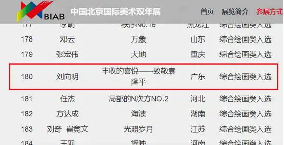 2025年11月24号,第十届中国北京国际美术双年展公布国内作品复评结果,刘向明的作品《丰收的喜悦——致敬袁隆平》(综合绘画类)以其独特的创作理念与深刻的文化内涵脱颖而出,成功入选。