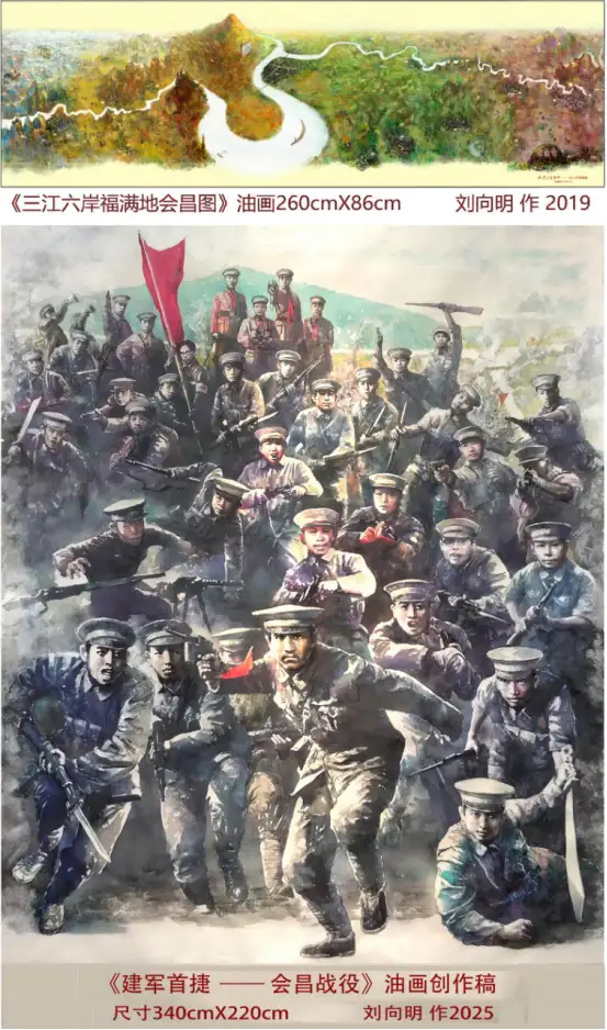 刘向明长期致力于主题性美术创作与文化实践,专注于红色文化传承与历史主题表达。故乡江西赣南会昌县是当年八一起义军南下首捷之福地,开国领袖也在这里度过了人生最低谷岁月,留下“风景这边独好”的著名诗句,踏上长征前程。刘向明曾以此意境创作了家乡风貌全景画《三江六岸福满地会昌图》,其独特的构思涵括了山河美景、历史典故及真实传奇等信息,以得道、聚义、生财之寓意被诸多商界人士热奉为吉祥风水挂画而复刻收藏。他还谱写演唱颂家乡的《你好会昌》等歌曲,运用多种艺术形式倾注对故土的深情,以尽游子的一份绵薄之力。目前,为迎接纪念长征胜利90周年及建军100周年的到来,他正努力挖掘家乡的革命历史素材积极创作,参与国家征集重大主题作品创作计划的申报,以艺术张力展现故乡被岁月尘封和淡忘的传奇,告慰这片红土地上为革命成功付出太多牺牲和贡献的先辈们。