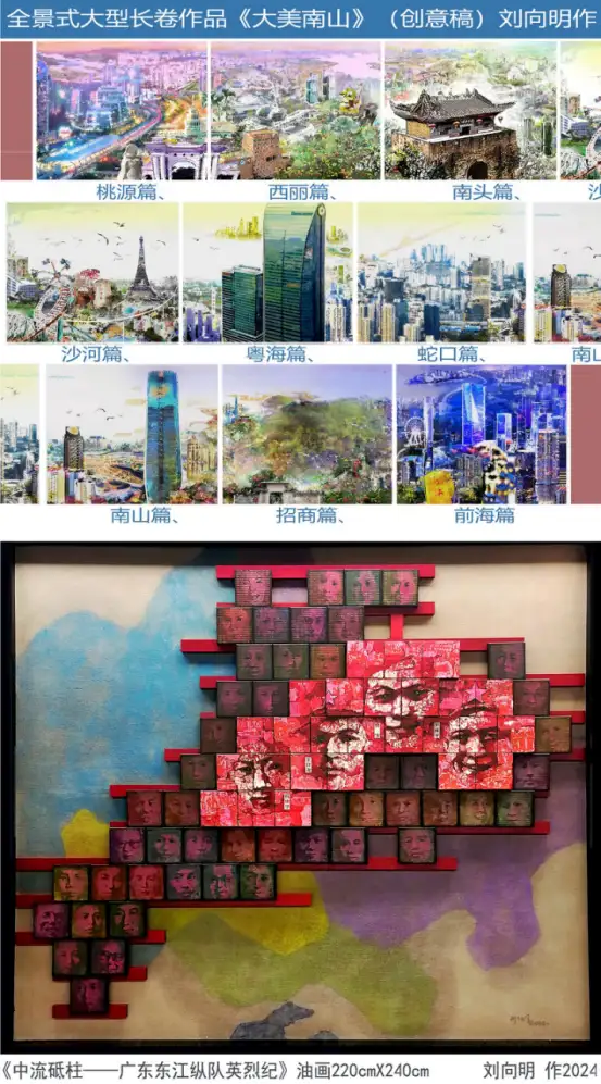 在深圳南山生活工作从艺30年间,刘向明的艺术创作与特区发展同频共振。2024年他创意全景式大型长卷作品《大美南山》,以9块既可独立成幅,又能自然衔接组合为全幅长卷画面的内容及形式,完整展现了南山区山海天地间日异月新的壮美全貌。整幅长景画面借以晨、日、夜的时光呈现景色,赋予“霞光万道”、“如日中天”、“星辰璀璨”吉祥寓意,献给为深圳的发展奉献了青春和正在奉献青春的建设者们,以精湛艺术讴歌这片热土的辉煌成就。在纪念抗日胜利80周年际,刘向明自发挖掘本土红色历史素材,创作巨幅主题性油画《中流砥柱——广东东江纵队英烈纪》和系列组画《芳华。东纵先辈艺术肖像》,获得了东纵后人们及社会各界的广泛赞誉。