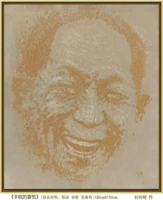 《丰收的喜悦——致敬袁隆平》的创作灵感,源于2021年5月“杂交水稻之父”袁隆平院士辞世后引发的全民深切缅怀。深受触动的艺术家刘向明,萌生了以艺术创作致敬科学巨匠的强烈愿望。在历经数轮构思几易其稿后,以袁老毕生心血所育的稻米为材料来构建其肖像的新创意产生。创作过程却遭遇材质霉变腐坏的意外挑战,刘向明历时数月反复试验,终于解决防腐难题,在翌年袁隆平院士的纪念月来临之际,再次完成了作品,将袁老灿烂温暖的笑容永恒地定格于艺术画面,赋予了作品更为深沉与持久的纪念意义。