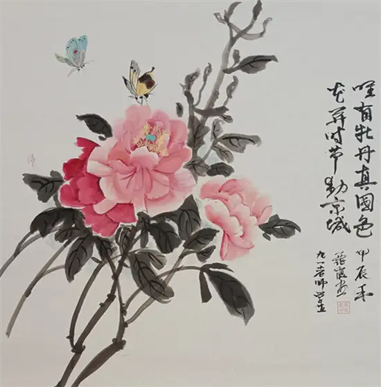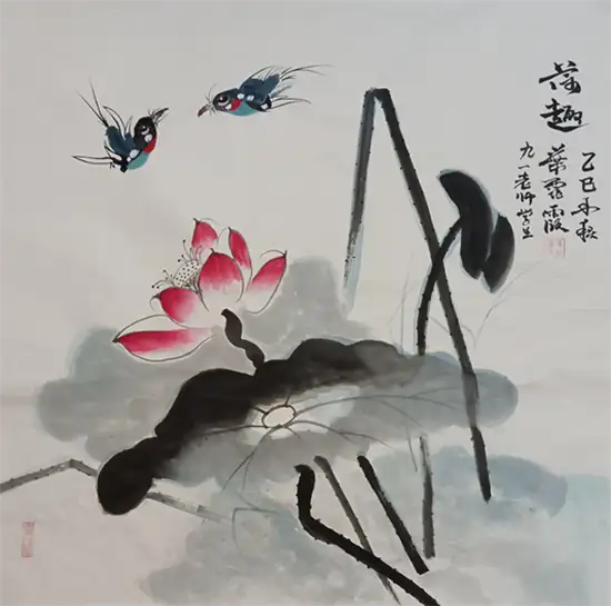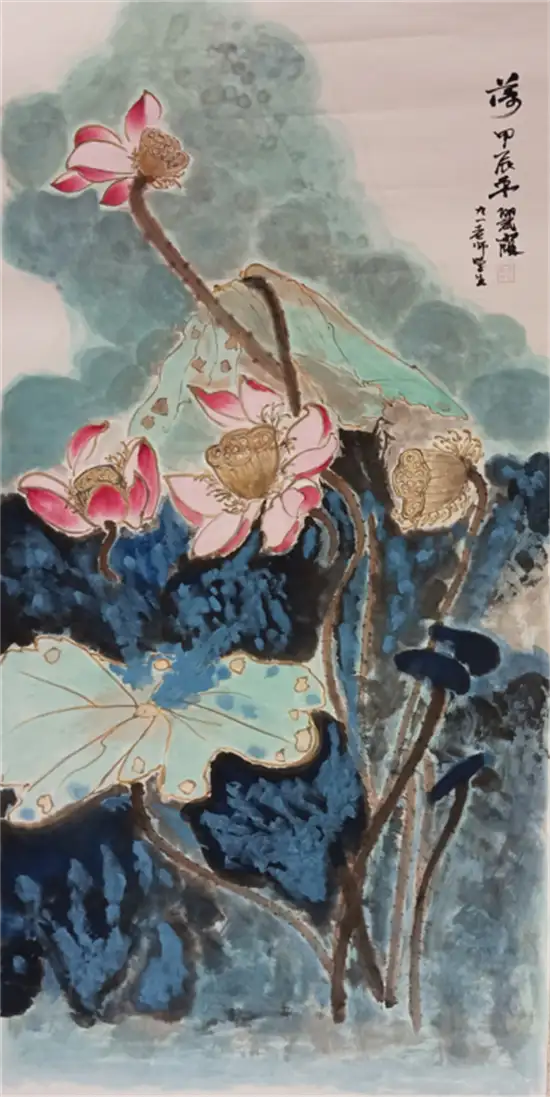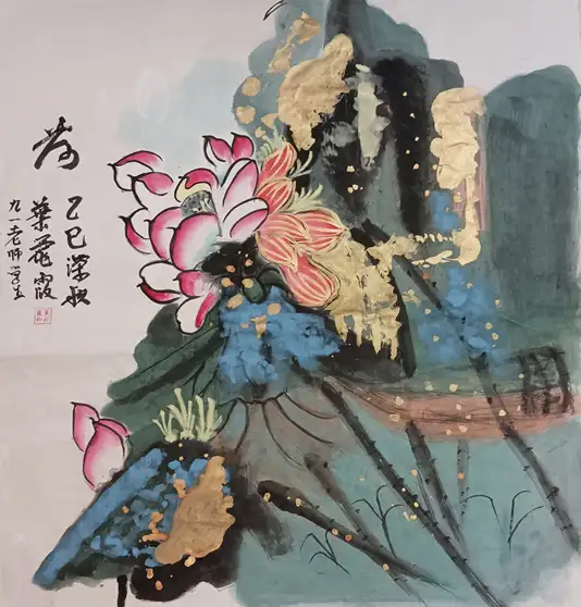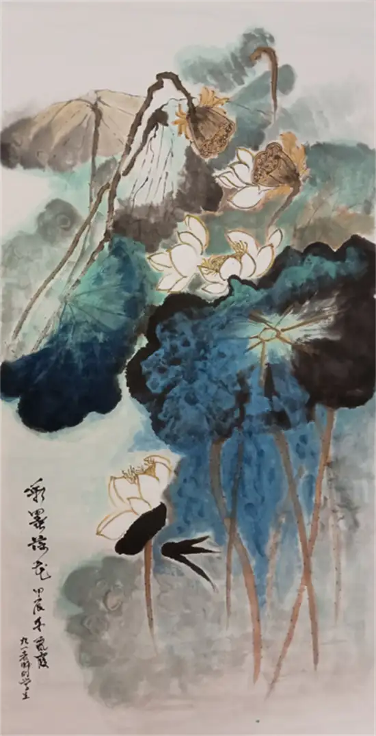 英国驻华大使馆文化处负责人表示:叶丽霞的这幅作品,红荷明艳、墨叶苍劲,衬以蓝绿底色显清雅,题字添文韵,是中式花鸟里“荷”的明艳与禅意交融。